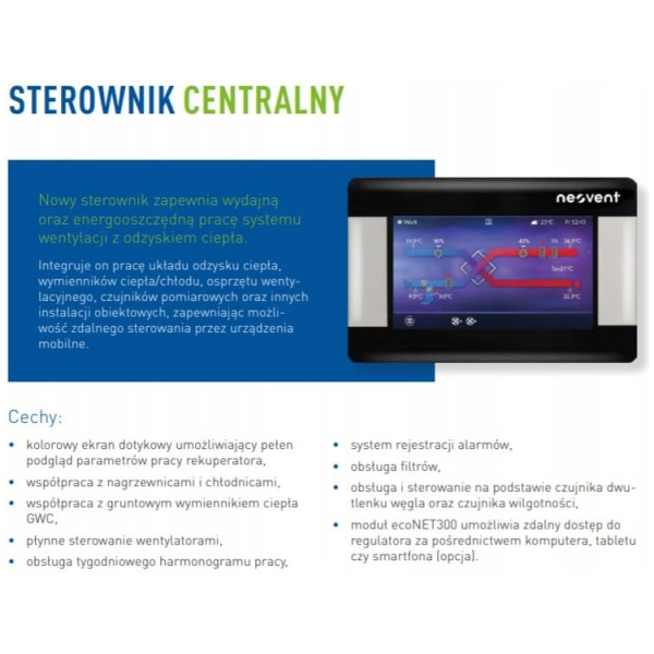 - Możliwość zdalnego sterowania i monitorowania pracy rekuperatora dzięki modułowi ecoNET300