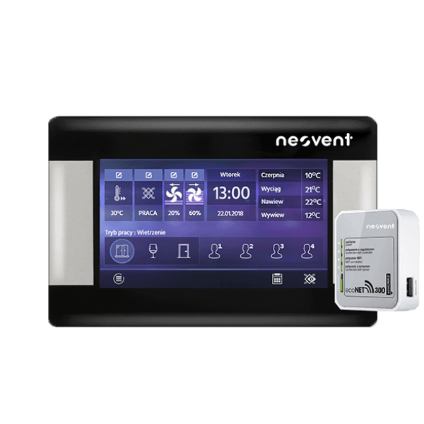 – kolorowy ekran dotykowy umożliwia pełen podgląd parametrów pracy rekuperatora. Wizualizacja pracy całego systemu.