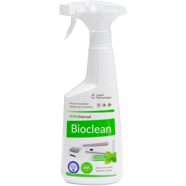 HVAC Internal Bioclean to uniwersalny produkt do dezynfekcji parowników i tac skroplinowych wewnętrznych jednostek urządzeń klimatyzacyjnych, klimatyzacyjno-wentylacyjnych a także filtrów powietrza. Niezawodny płyn zapewniający doskonałą higienę. Usuwa także przykre zapachy i skutecznie dezodoryzuje klimatyzację zapewniając przyjemny, świeży zapach. Badania potwierdzające skuteczność produktu HVAC Internal Bioclean przeprowadzone były w dwóch niezależnych laboratoriach. Wyniki badań potwierdziły działanie produktu wobec bakterii i grzybów bytujących w układach klimatyzacyjnych: Escherichia coli, Staphylococcus aureus, Klebsiella pneumoniae, Enterococcus hirae, Legionella pneumophila, Pseudomonas aeruginosa oraz Aspergillus brasiliensis i Candida albicans. HVAC Internal Bioclean, pomimo posiadania aktywności wobec drobnoustrojów, wykazuje brak interakcji z powierzchniami z tworzyw sztucznych, ceramiki, drewna, stali nierdzewnych, aluminium oraz miedzi. Produkt posiada certyfikaty Urzędu Rejestracji Produktów Leczniczych, Wyrobów Medycznych oraz Produktów Biobójczych (URPL), a także Narodowego Instytutu Zdrowia Publicznego – Państwowego Zakładu Higieny (PZH).