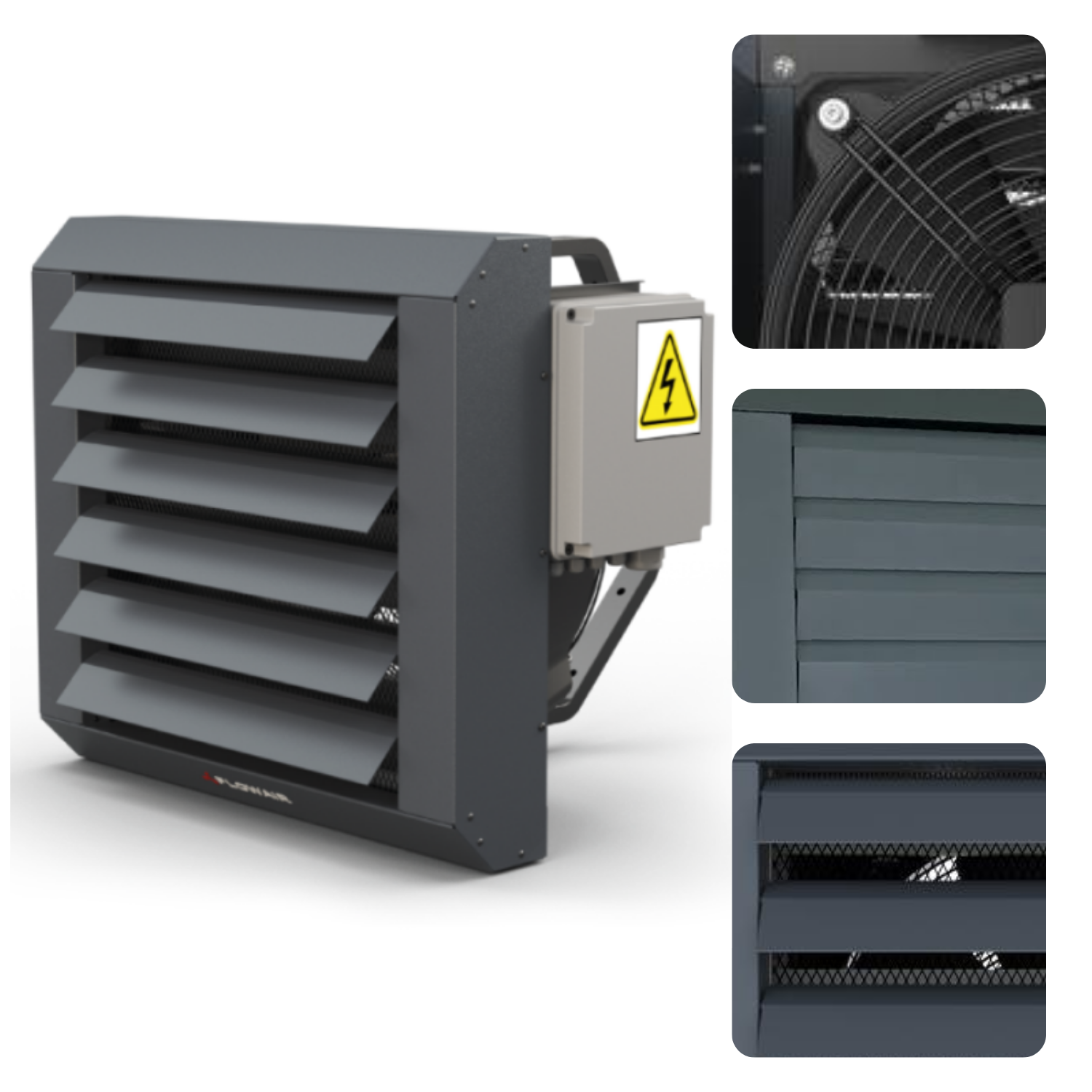 Dzięki maksymalnemu strumieniowi przepływu powietrza wynoszącemu 2000 m3/h, nagrzewnica skutecznie ogrzewa pomieszczenia o dużej objętości. Urządzenie zasilane jest napięciem 3 x 400 V/Hz oraz dysponuje prądem znamionowym równym 15,6 A. Klasa ochrony IP 20 zabezpiecza urządzenie przed wnikaniem ciał stałych o średnicy większej niż 12,5 mm, co czyni je odpowiednim do użytku wewnątrz pomieszczeń.