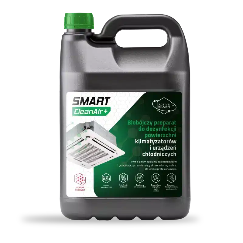 Biobójczy preparat do dezynfekcji 5 L Smart CleanAir+ jest zaawansowanym rozwiązaniem przeznaczonym do dezynfekcji elementów powierzchni układów klimatyzacji i wentylacji w obiektach prywatnych oraz komercyjnych. Preparat utrzymuje wysoki poziom higieny i czystości systemów HVAC, co jest kluczowe dla efektywności funkcjonowania urządzeń oraz jakości powietrza. Produkt jest przeznaczony do użytku profesjonalnego, co oznacza, że jego stosowanie zaleca się nie rzadziej niż co 6 miesięcy w celu zachowania optymalnych parametrów eksploatacyjnych. Preparat jest dostarczany w formie gotowej do użycia, co ułatwia jego aplikację. Doskonale sprawdza się w czyszczeniu: Filtrów powietrza, kanałów wentylacyjnych, tacek ociekowych, lameli, skraplaczy, wymienników ciepła, jednostek zewnętrznych, urządzeń chłodniczych, przemysłowych ciągów, wentylacji gastronomicznych, okapów kuchennych, parowników, pomp ciepła.