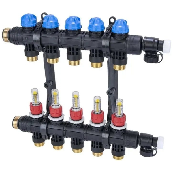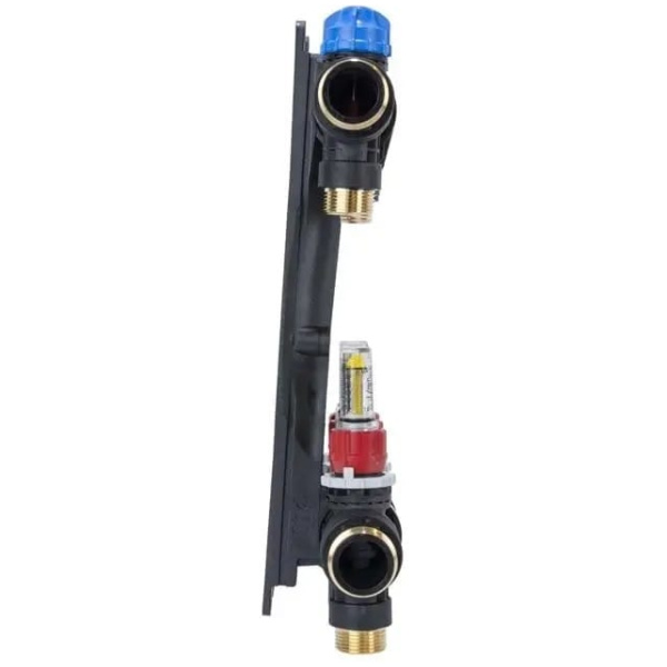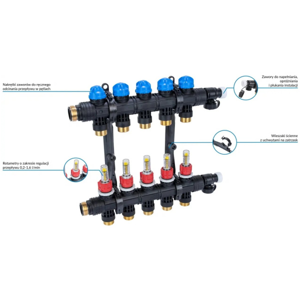 Wbudowane rotametry posiadają możliwość wymiany bez spuszczania medium z instalacji oraz regulację przypływu w zakresie 0,2 – 1,6 l/min. Obie belki zostały zakończone zaworami do napełniania, opróżniania i płukania instalacji. Dodatkowo belka powrotna została wyposażona w nakrętki zaworów do ręcznego odcinania strumienia w danej pętli.