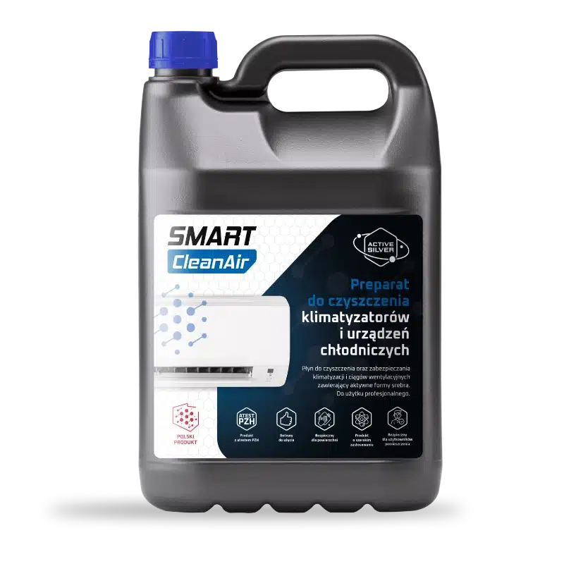 Preparat do czyszczenia 5 L Smart CleanAir to wysokiej jakości produkt, stworzony z myślą o różnorodnych systemach klimatyzacyjnych oraz chłodniczych. Jego zaawansowana technologia dwufazowa zapewnia natychmiastowe usuwanie patogenów oraz długotrwałą ochronę dzięki działaniu aktywnych form srebra. Preparat jest gotowy do użycia i przeznaczony do codziennego utrzymania czystości w obiektach komercyjnych i domowych. Smart CleanAir efektywnie eliminuje brud, kurz oraz osady, zapewniając bezpieczeństwo stosowania na różnych powierzchniach, takich jak tworzywa sztuczne, metale, ceramika, szkło, aluminium oraz powierzchnie lakierowane. Produkt o pojemności 5 L, wyprodukowany przez Smart Nanotechnologies S.A., jest idealny do zastosowania w systemach HVAC w różnych branżach, co wspomaga dbałość o czystość oraz jakość powietrza w pomieszczeniach. Preparat sprawdza się w czyszczeniu: filtrów powietrza, kanałów wentylacyjnych, tac ociekowych, lamelek, skraplaczy, wymienników ciepła, jednostek zewnętrznych, urządzeń chłodniczych, przemysłowych ciągów, wentylacji gastronomicznych, okapów kuchennych, parowników, oraz pomp ciepła.
