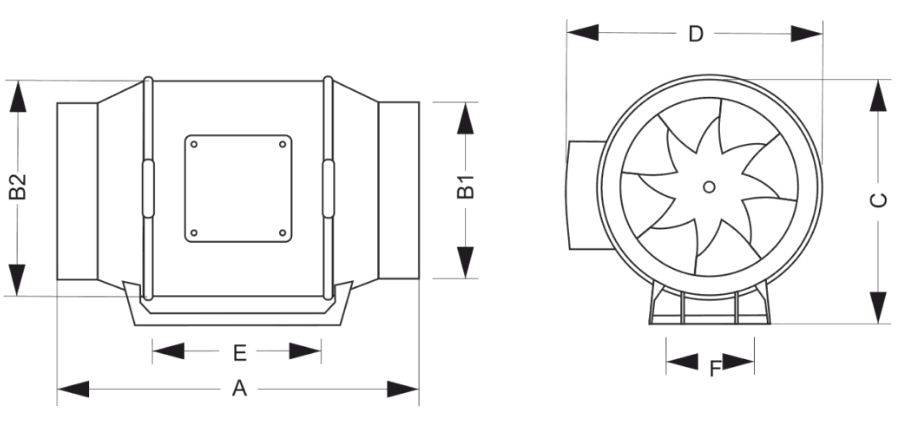 Właściwości techniczne wentylatora obejmują także ciśnienie statyczne o wartościach 460 Pa oraz prędkość obrotową silnika na poziomie 2650 obr/min. Urządzenie jest przystosowane do pracy w szerokim zakresie temperatur, od -20 do +50°C, co zapewnia jego stabilność w różnych warunkach otoczenia. Zasilanie odbywa się przez napięcie 220-230 V przy częstotliwości 50 Hz. Wentylator ten cechuje klasa ochrony IPX2, co gwarantuje jego bezpieczeństwo w użytkowaniu. Wymiary wentylatora to: 377 mm (A), 245 mm (B1), 265 mm (B2), 280 mm (C), 280 mm (D), 135 mm (E) oraz 100 mm (F). Waga netto urządzenia wynosi 5,44 kg, a waga brutto to 6 kg.