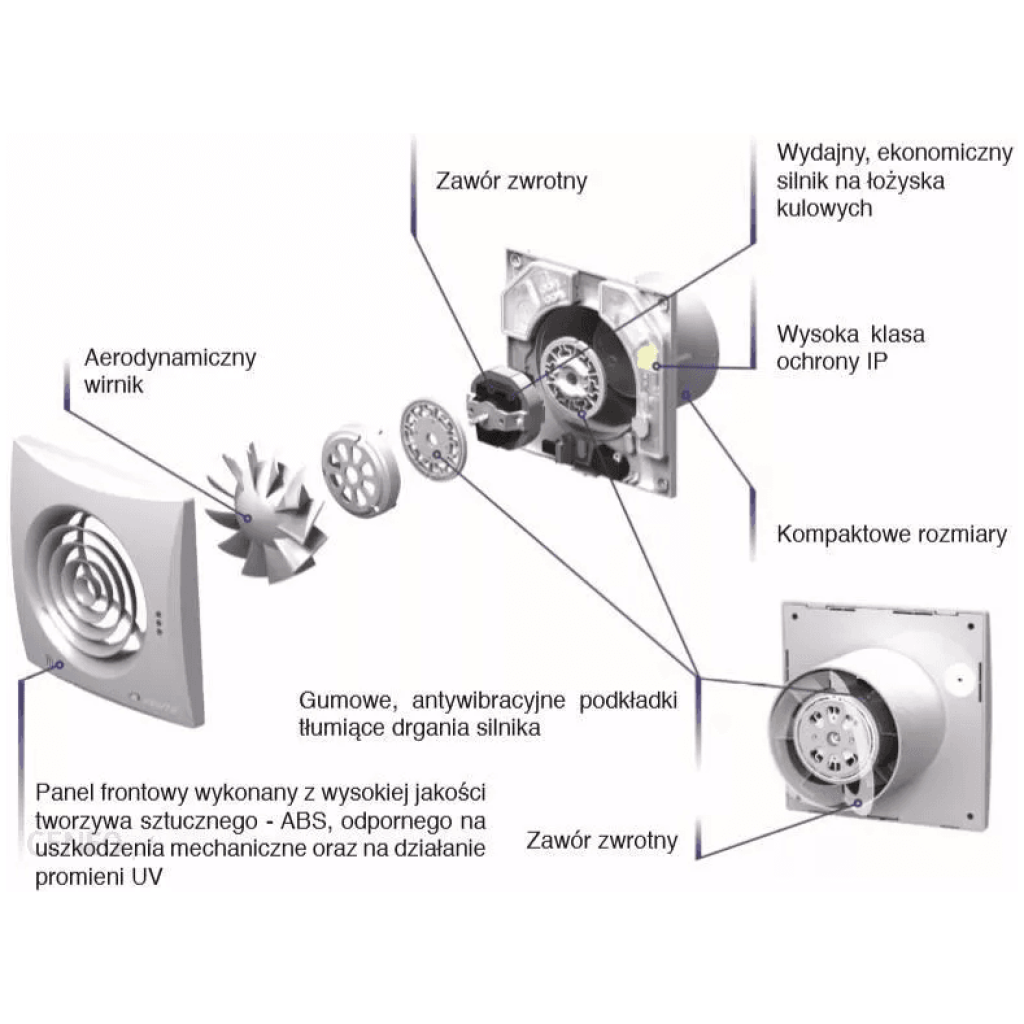 Wentylator domowy AirRoxy z serii pRim wyróżnia się wyjątkową cichością, białym kolorem i wysokiej klasy łożyskiem ślizgowym. Łopatki turbiny są precyzyjnie kształtowane, co gwarantuje cichą i energooszczędną pracę. Trwałość i estetykę urządzenia zapewnia wysokiej jakości tworzywo, a delikatna kratka frontu inspirowana jest morską falą. Wentylator doskonale sprawdzi się nie tylko w łazience, ale także w biurze czy kuchni. Model S podłączany jest do zasilania o napięciu 230V i może współpracować np. z lampą. Wentylatory AirRoxy wyposażone są w zabezpieczenie termiczne, chroniące przed przegrzaniem. Urządzenie ma średnicę 100 mm, a opcjonalnie można zamontować zawór zwrotny.