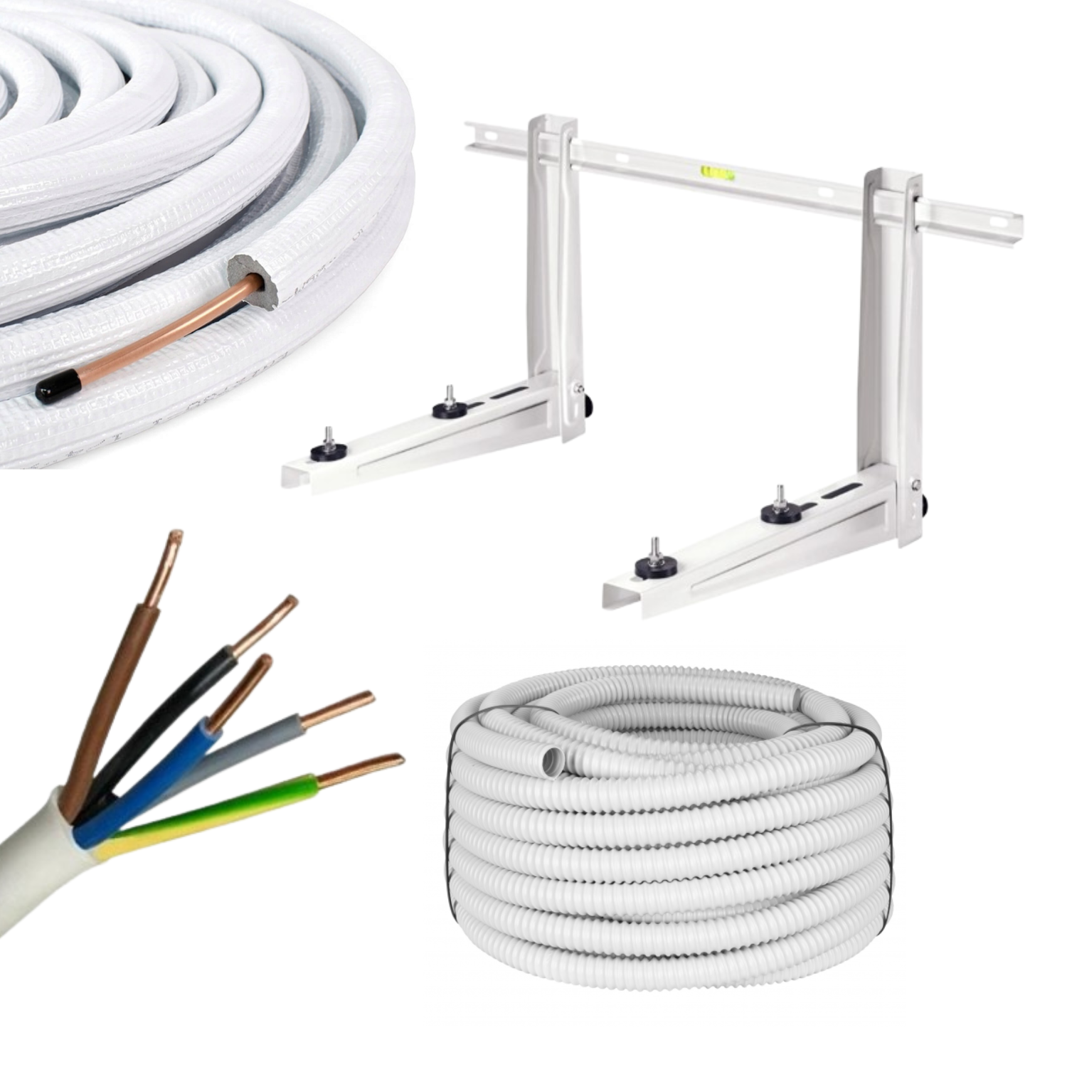 1 szt. Wspornik składany do jednostki zewnętrznej klimatyzatora 465 mm z poprzeczką 800 mm – RODIGAS MS253, Zestaw rur miedzianych 1/4 + 3/8 do klimatyzacji 3 m – OTTOCOOL FRIGOLINE, 3 m.b., Przewód karbowany wąż elastyczny śr. 16 mm – Profesta, 3 m.b., Przewód instalacyjny okrągły YDY 5×1,5 żo 450/750V – DAMIR |