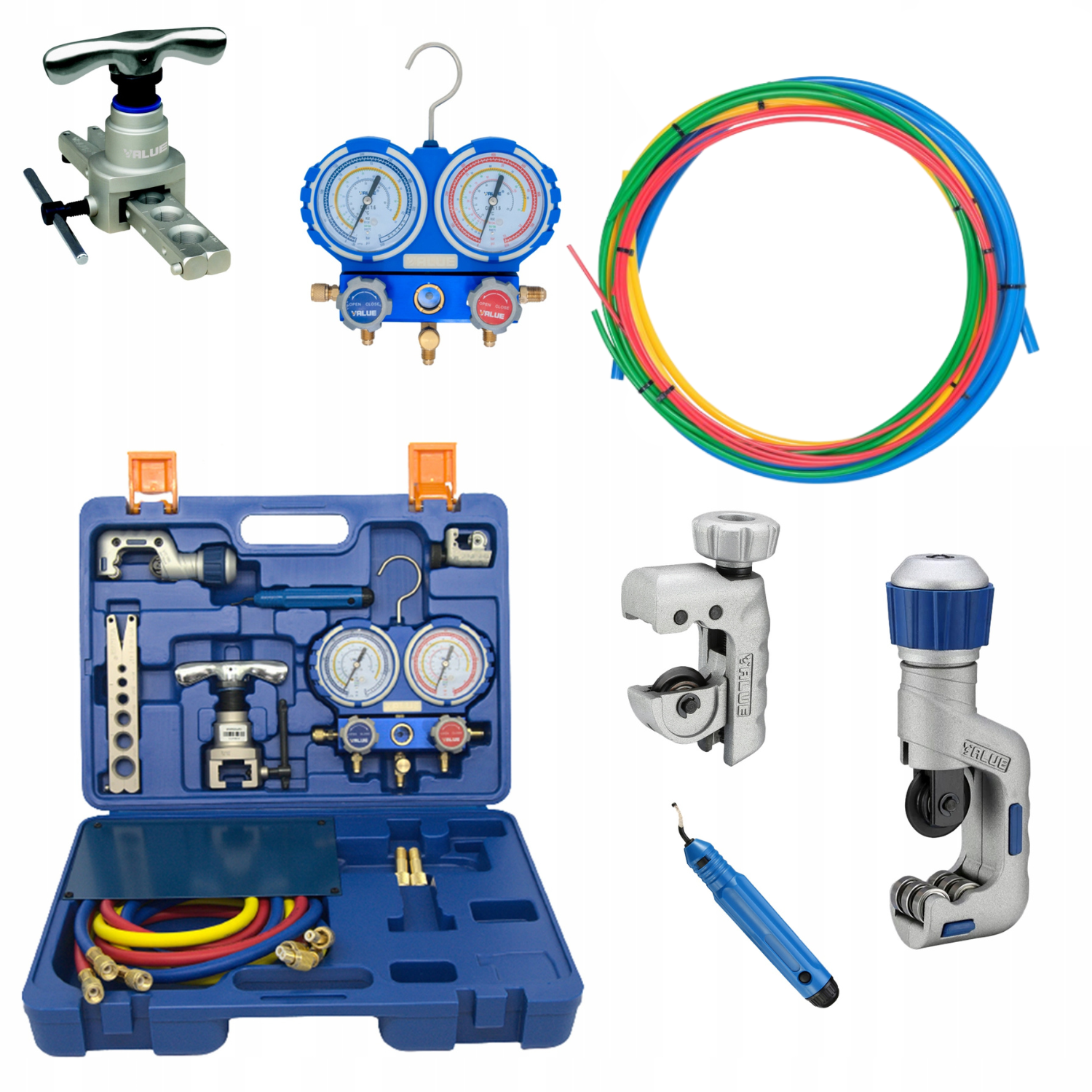 1x kielicharka, 2x nóż do rur, 1x manometr, 3x wąż serwisowy, 1x gratownik, 1x walizka plastikowa |