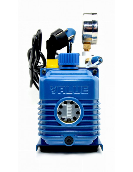 Pompa próżniowa 51 l/min jednostopniowa z wakuometrem VALUE V-i120SV to solidne narzędzie o dużej wydajności. Model V-i120SV cechuje się głębokością próżni na poziomie 150 mikronów, co zapewnia skuteczność na poziomie 99,99%. Pompa posiada przyłącze 1/4″ SAE, a jej silnik charakteryzuje się mocą 0,25 KM (0,18 kW). Dodatkowo, w komplecie znajduje się olej, co sprawia, że urządzenie jest gotowe do natychmiastowego użytku.